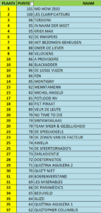 Van de pakweg 200 aanwezige bollebozen mocht het team Mo How Zeg! uit Aarsele zich uiteindelijk uitroepen tot de ‘slimste’ van de avond. Zij werden op de voet gevolgd, op slechts één puntje afstand, door de winnaars van vorig jaar het team Les Clarificateurs uit Deinze. Het brons van de avond ging naar het team Terdonk uit Vinderhoute.